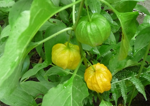 何年か前にホオズキ市で買ったものだとして、赤いホオズキの鉢をもらいました。それを庭に下ろしたら忽ち増えて雑草状態になったので、今年は一本だけ残しました。するとなんとしたことが、黄色なのです。これから赤くなるのでしょうか?聞くところによると、これから赤くなるそうです。楽しみに待ちます。